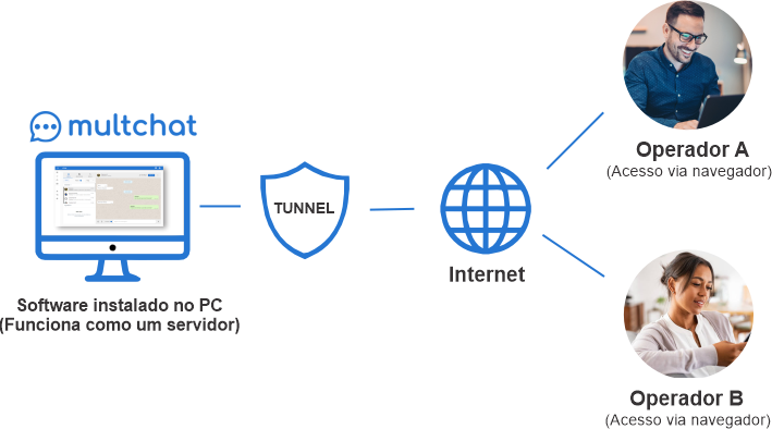 O software é operado diretamente no seu computador ou servidor VPS, e usa os recursos locais de memória, processamento e armazenamento.